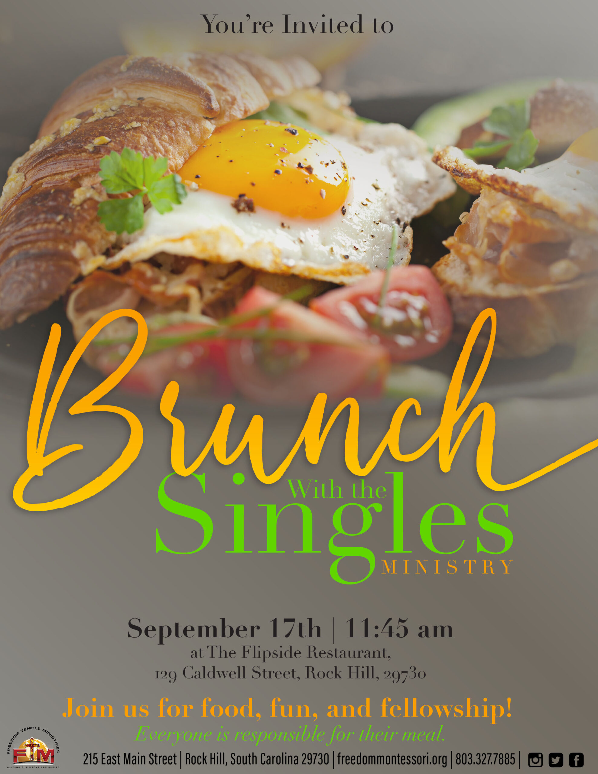 Brunch with the Singles' Ministry, Sunday, September 17th, immediately following service at Flipside Restaurant.