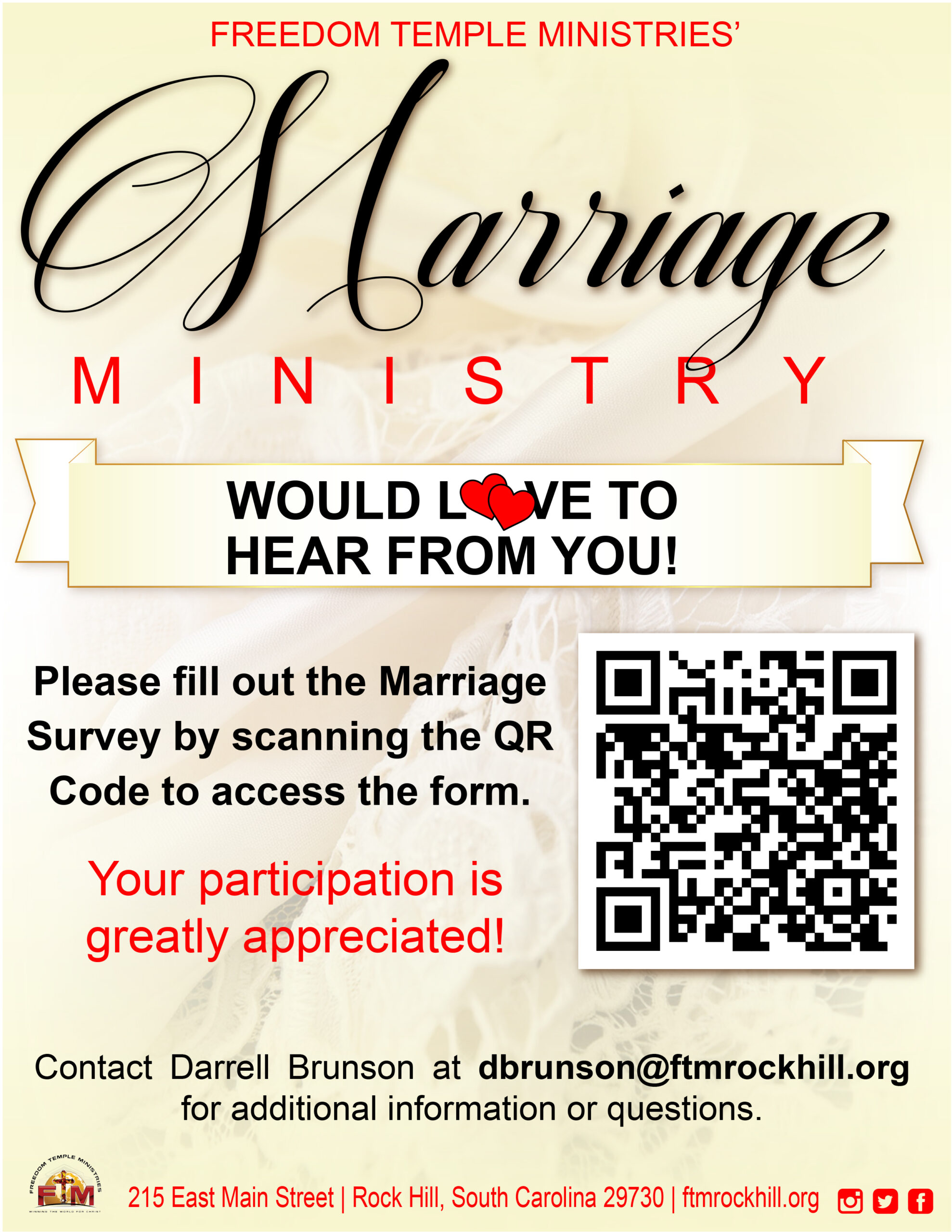 The Marriage Ministry would love to hear from you! Please scan the QR Code to fill out the Marriage Survey!