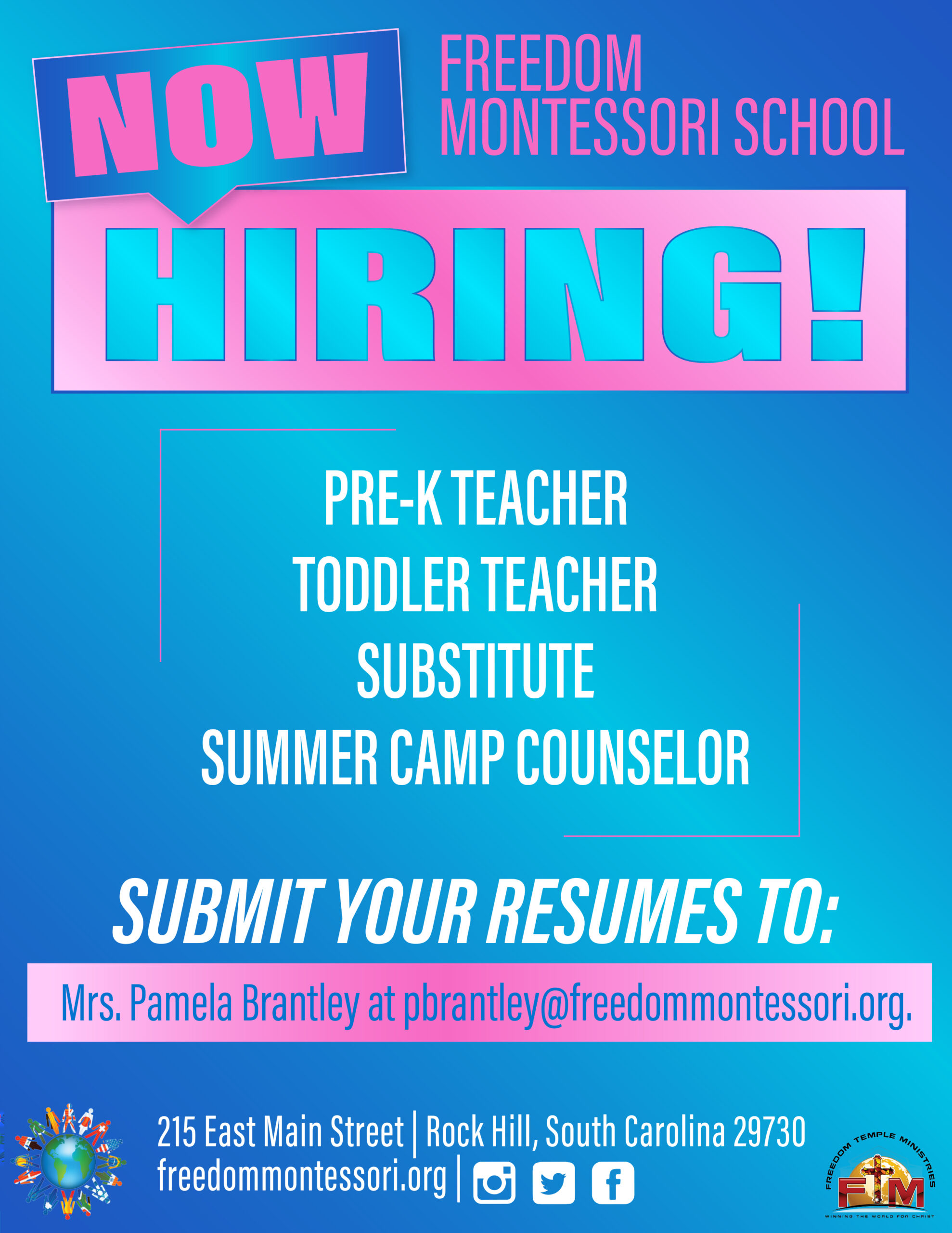 Now hiring for Freedom Montessori School - Pre-K Teachers, Toddler Teachers, Substitutes, and Summer Camp Counselors. |