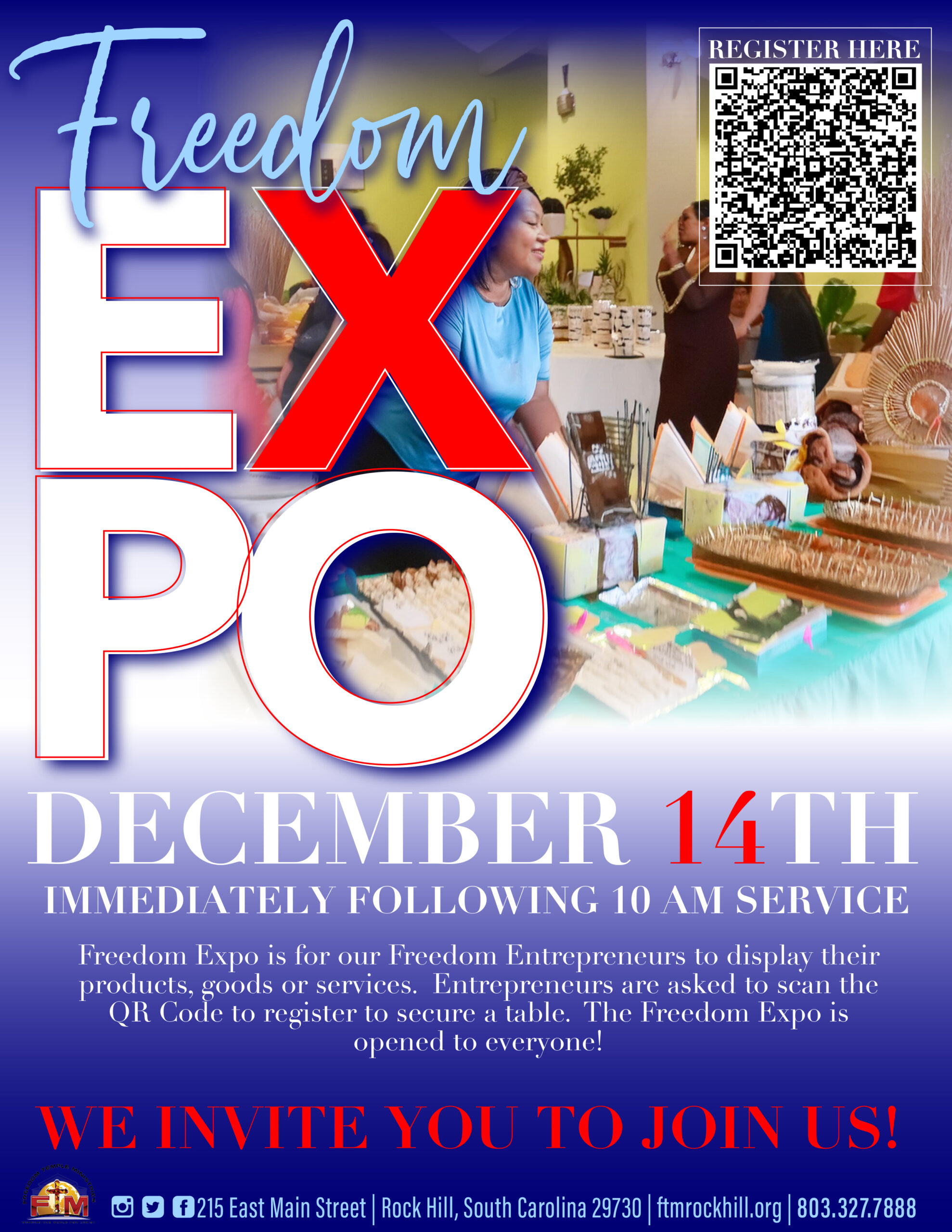Freedom Expo is for Freedom Entrepreneurs to display their products/goods, or services. The Expo will be held on Sunday, December 14th, immediately after the 10am service! Scan the QR Code or click HERE to register for a table! |